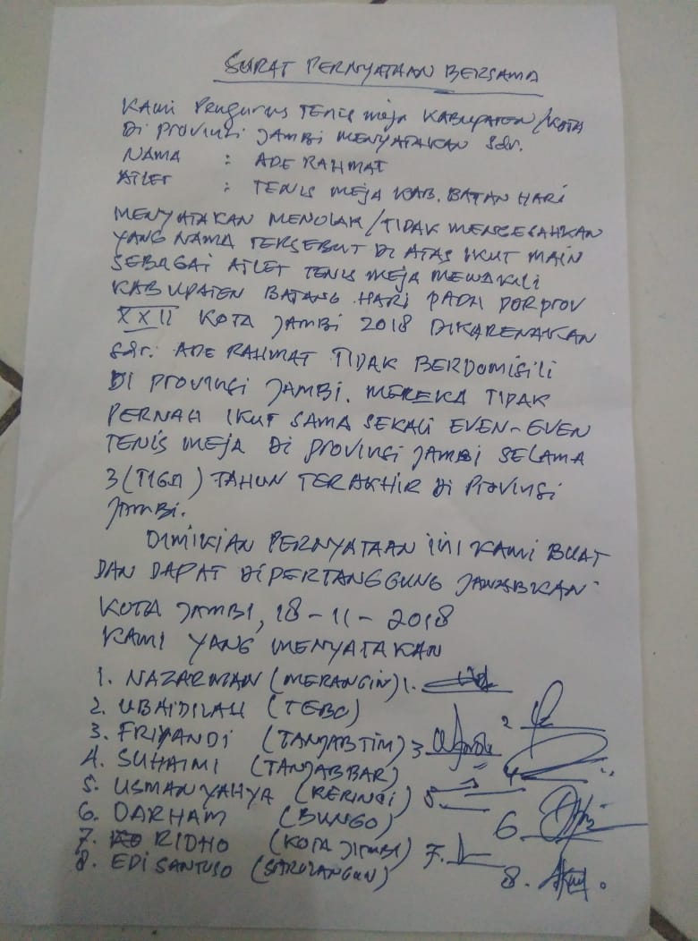 Dalam surat penolakan delapan pengurus Cabang Tenis meja, menyatakan atlet Batang Hari atas nama Ade Rahmad dianggap melanggar aturan dan komitmen bersama. Yang bersangkutan dinilai sengaja didatangkan dari luar Provinsi untuk ikut memperkuat tim Tenis Meja Batang Hari.