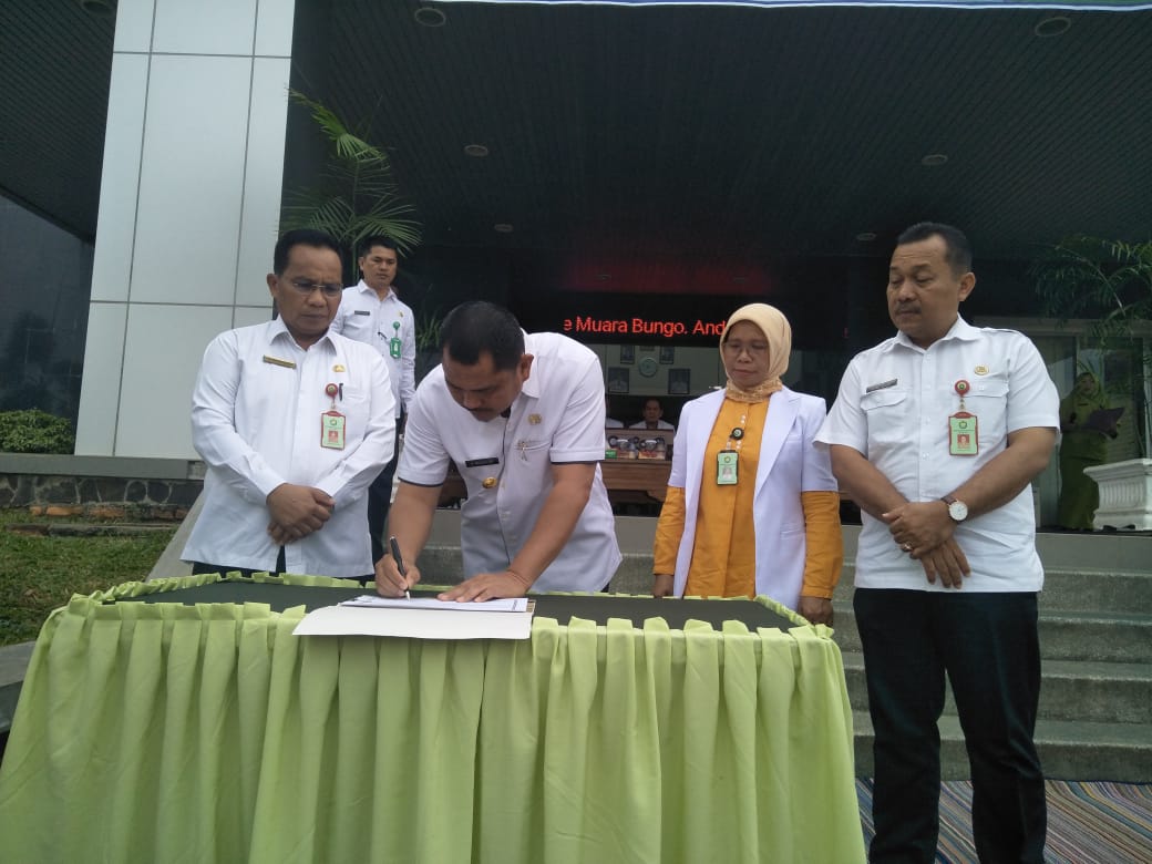 dr Mardiah bersama Sekda Bungo dan Kepala Dinkes Bungo menyaksikan penandatanganan berita acara oleh Bupati H Mashuri |