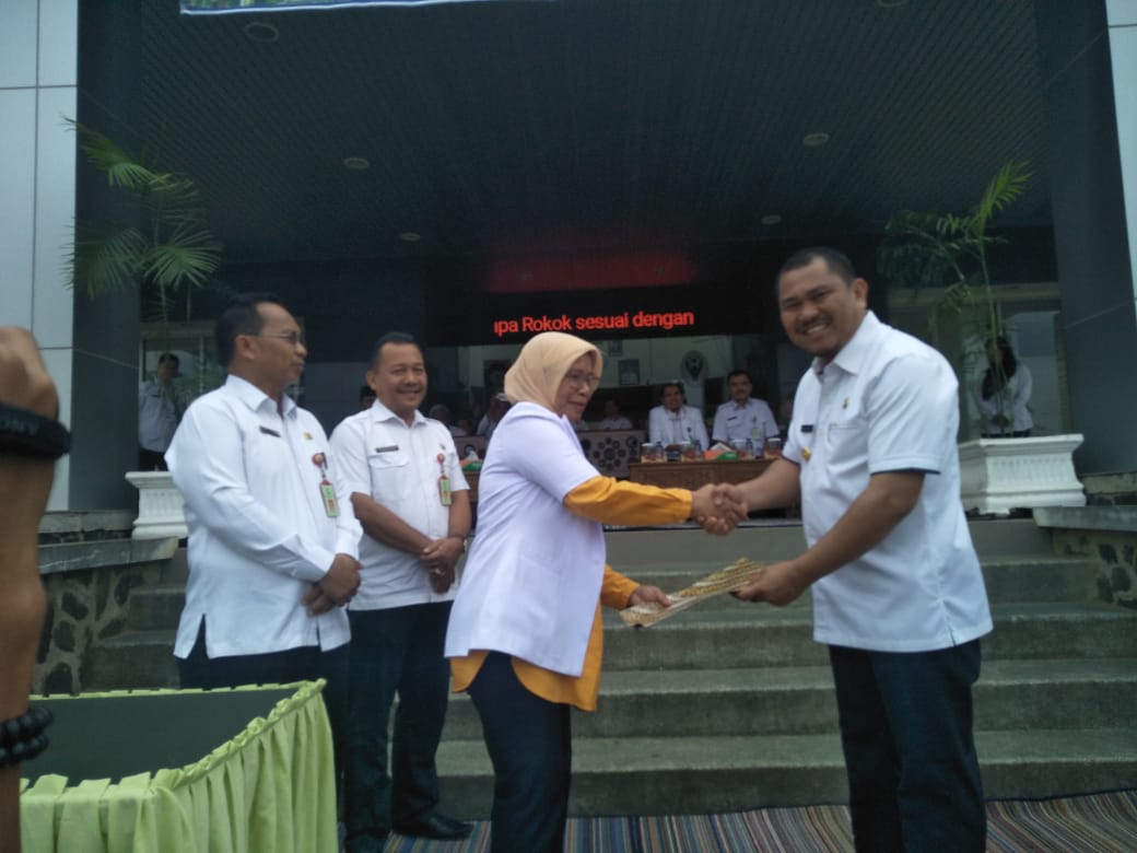 Penyerahan berita acara deklarasi dari Dirut RSUD H Hanafie dr Mardiah kepada Bupati H Mashuri. (Foto: Taufik) |